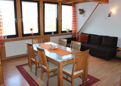 Sidebord mit Fernseher, Kaminofen, ausklappbares Schlafsofa, Tisch mit 6 Stühlen.